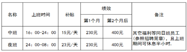 6、岗位补贴:焊锡、含浸、测试、外观等岗位200元/月;