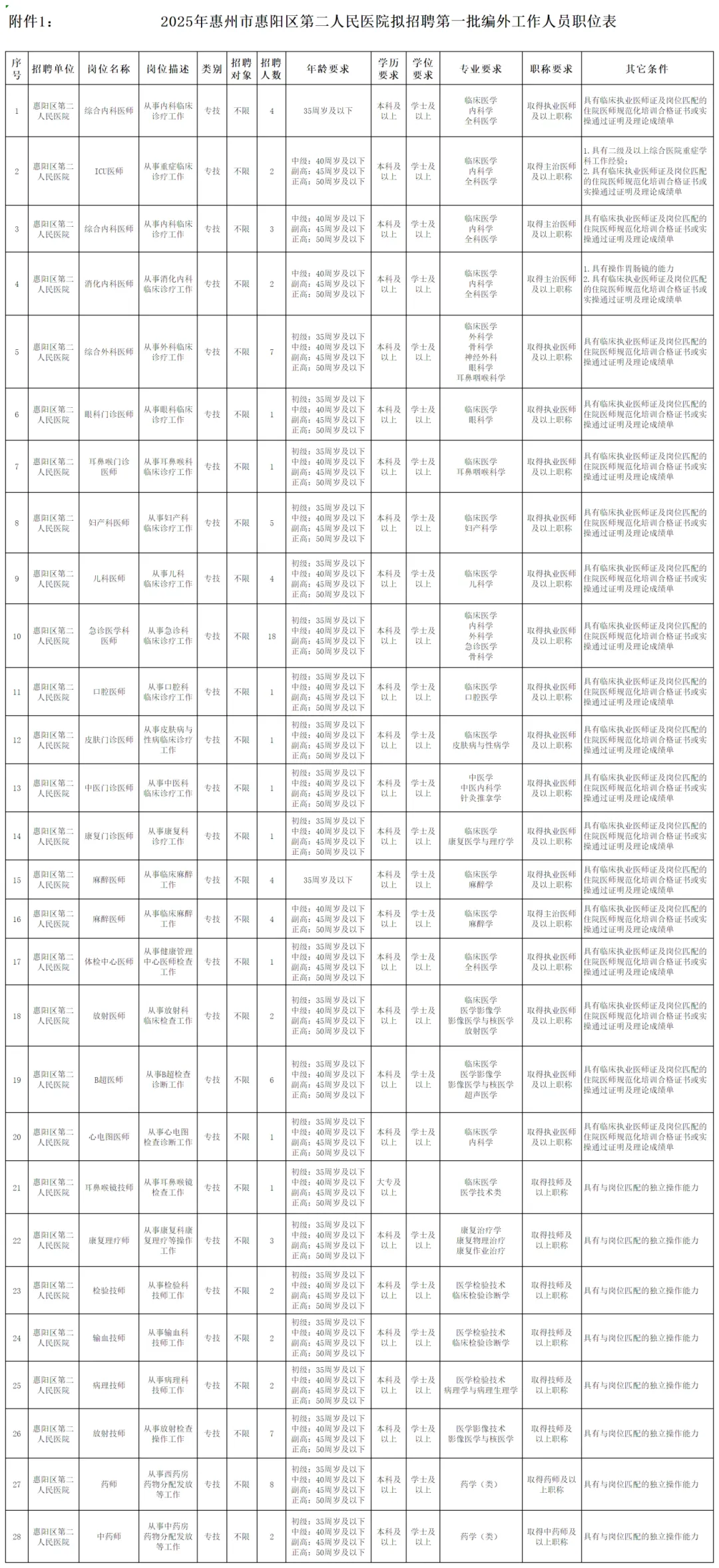 岗位年龄、学历、学位、职称、其他条件详见《附件1:2025年惠州市惠阳区第二人民医院拟招聘第一批编外工作人员职位表》。