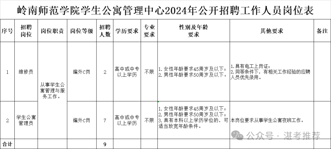 湛江岭南师范学院学生公寓管理中心2024年公开招聘工作人员公告