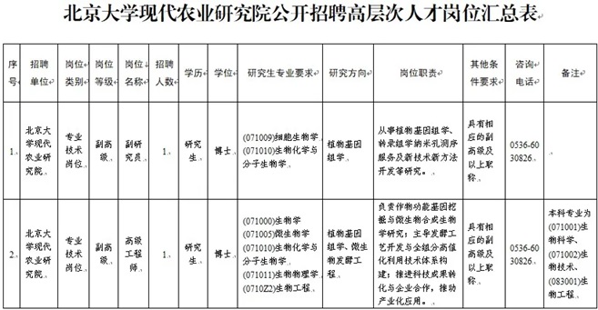 京大学现代农业研究院是由北京大学与山东省人民政府共同建设的研究性公益二类事业单位。坐落于风景秀丽的潍坊市峡山生态经济开发区。世界著名生物学家、美国科学院院士、北京大学教授邓兴旺任院长。研究院致力于开展前沿农业研究,积极服务国家及地方重大战略,其建设目标是10年内建成国际领先的现代农业科研机构。以北京大学现代农业研究院为依托建设的潍坊现代农业山东省实验室,拟建成多板块创新集群实验室或公共平台。 因研究院发展需要,现面向社会公开招聘工作人员。